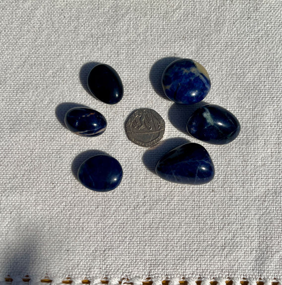 Beautiful dark blue Sodalite tumblestones, ideal for carrying in your pocket or placing on the body during a crystal healing. You can choose from large £1.50 or small £1 - see the photograph with the coin for size.